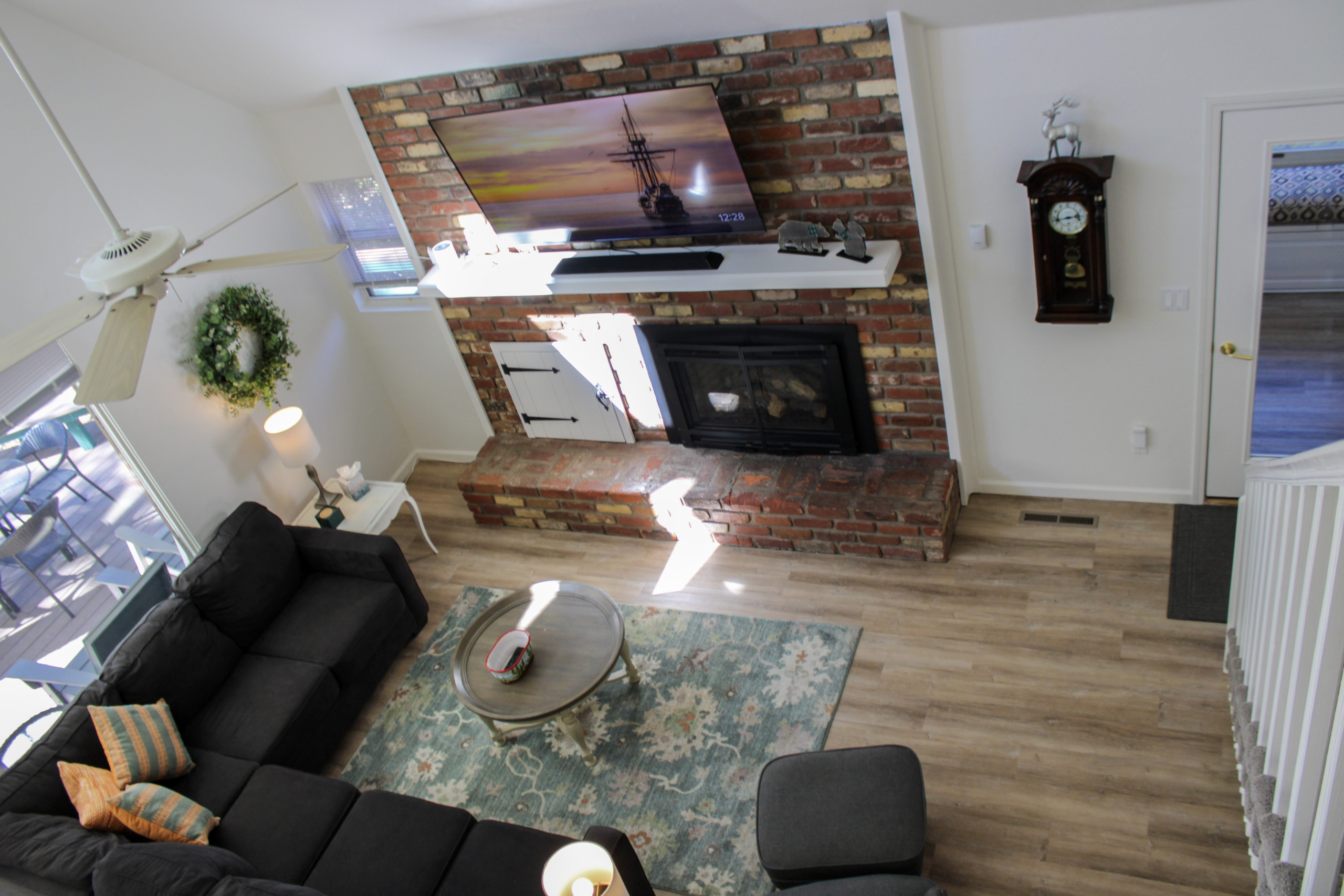 Living Room: Unwind in style with comfortable seating, a cozy fireplace, and three Vizio TVs equipped with Roku for your entertainment.
