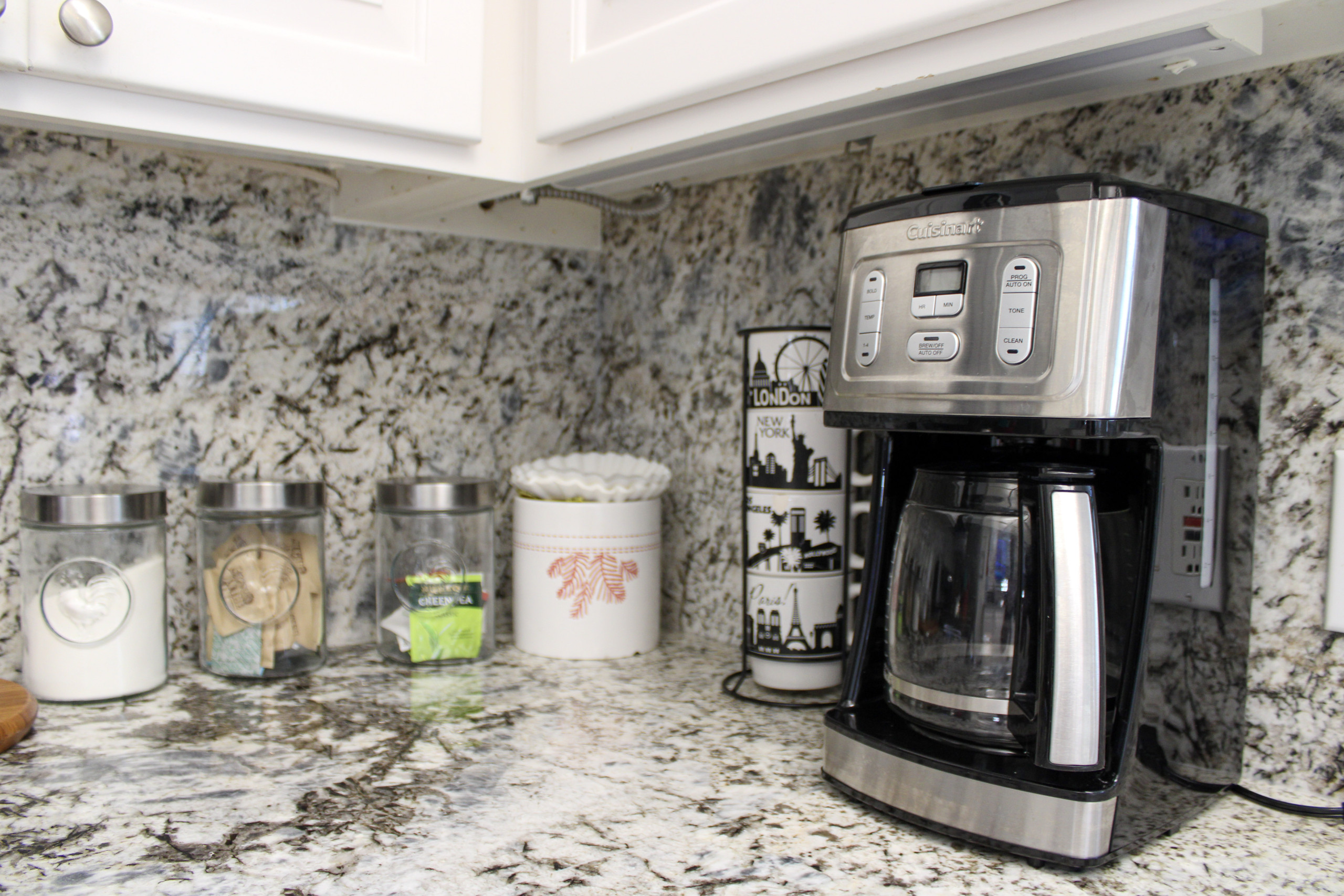 Fully stocked kitchen with modern white-on-white design, dishwasher.