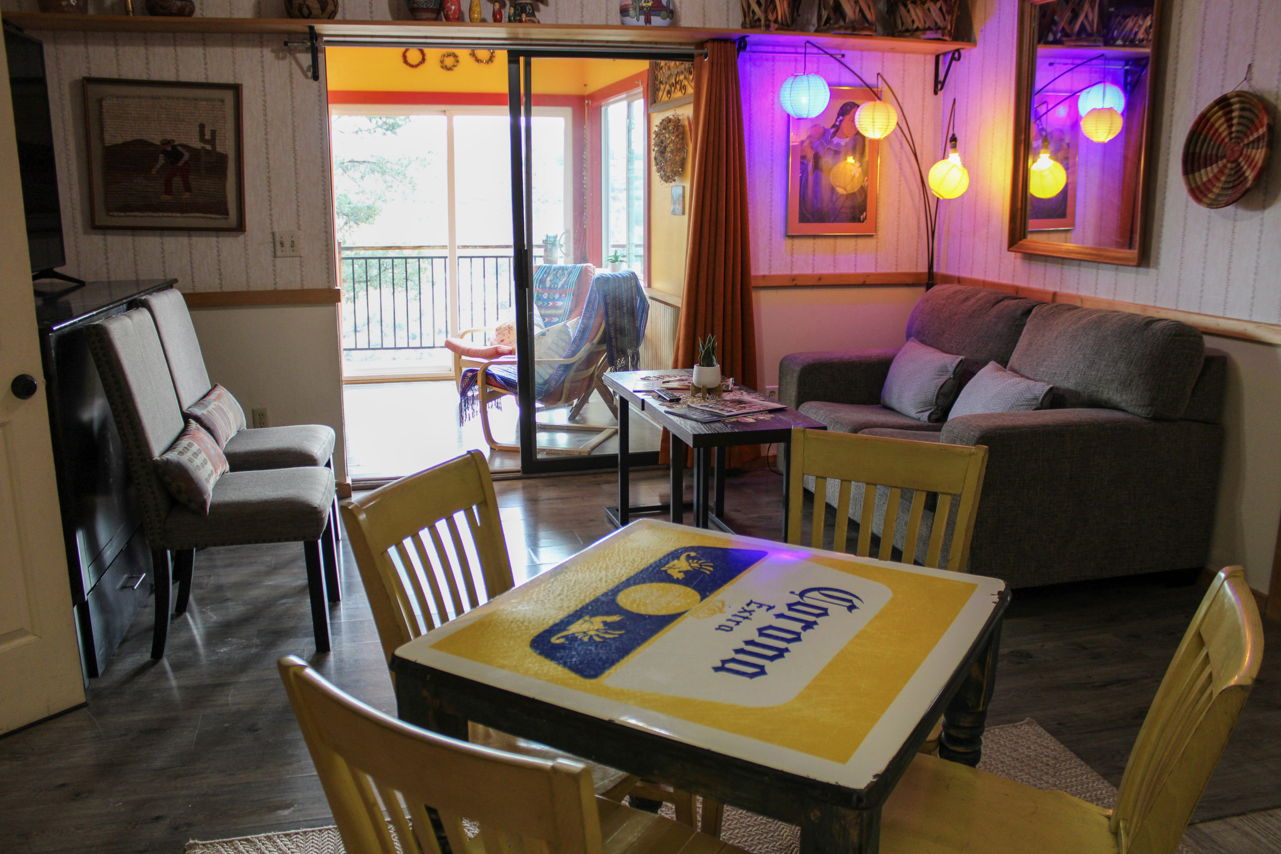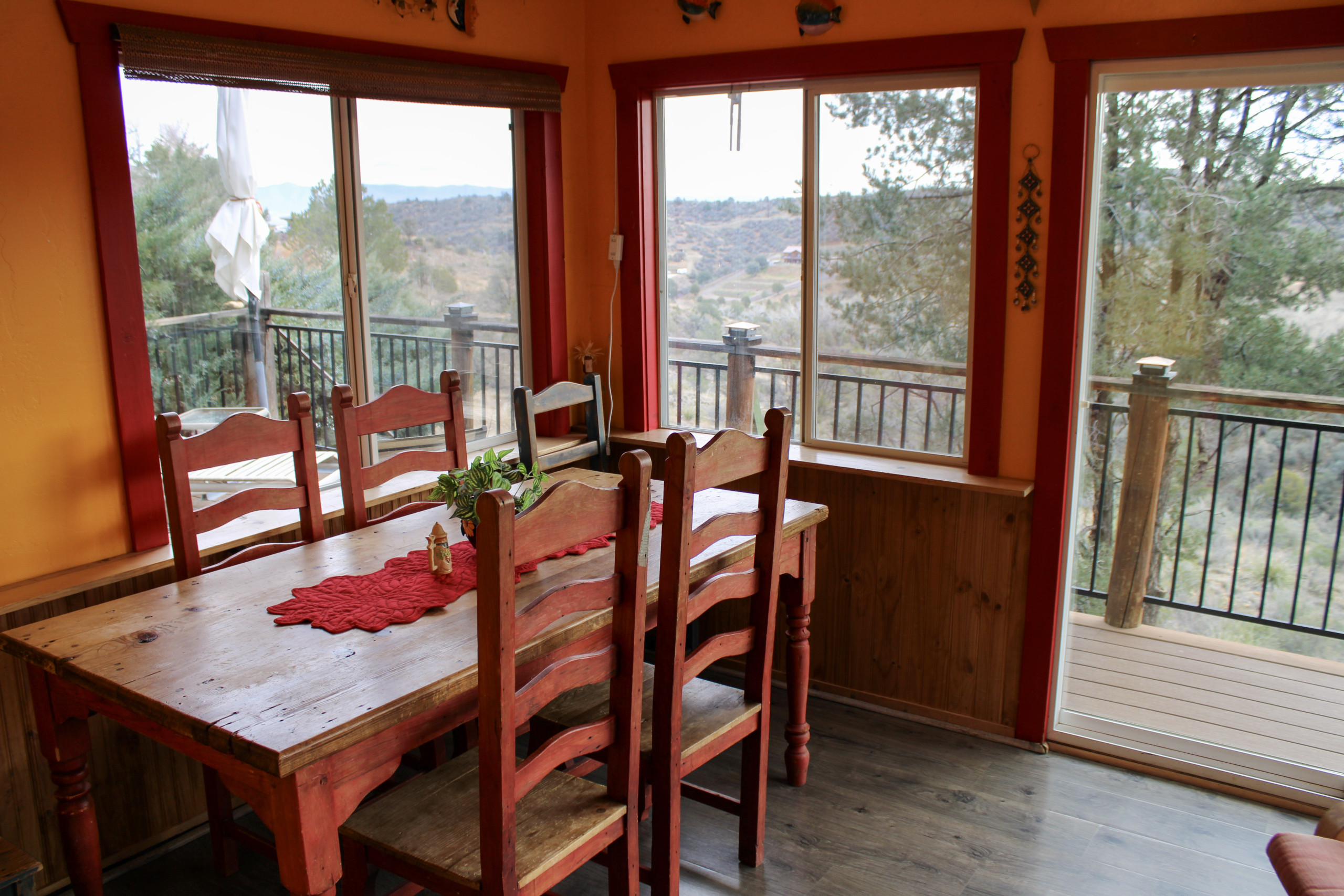 The Arizona room includes a large table that comfortably seats eight, perfect for dining, playing games, or simply relaxing. Step outside to your private, east-facing deck where you’ll find a four-person hot tub and a propane grill for outdoor cooking, all with lovely views.